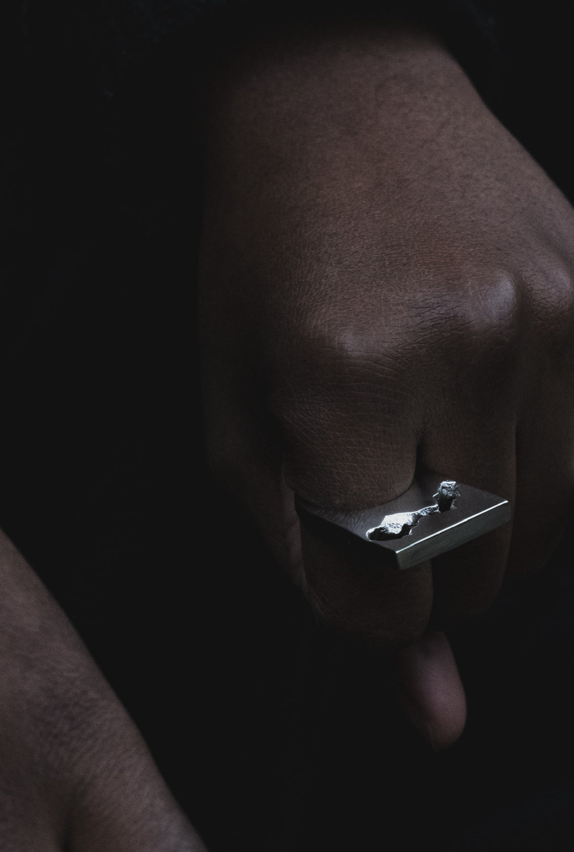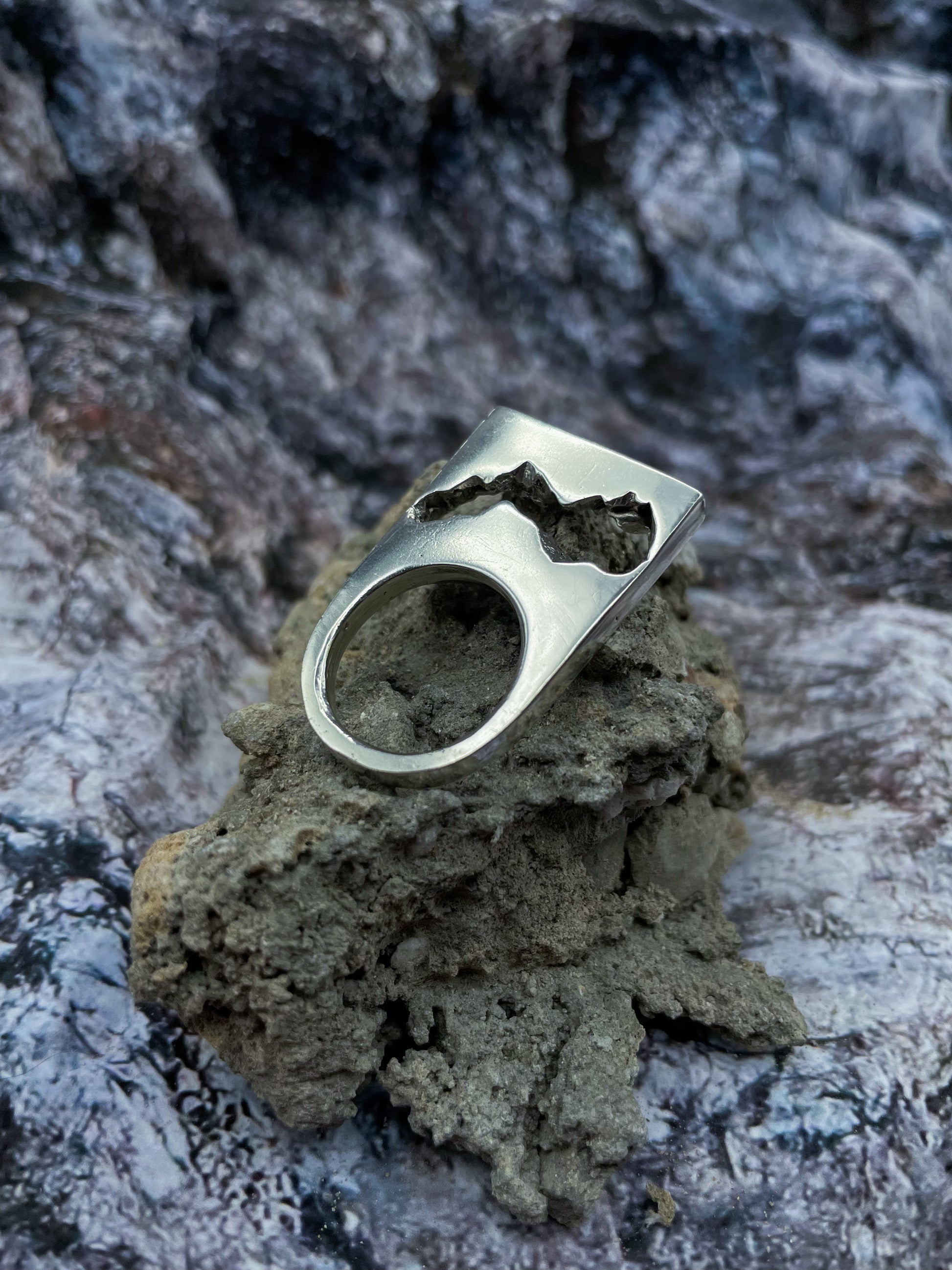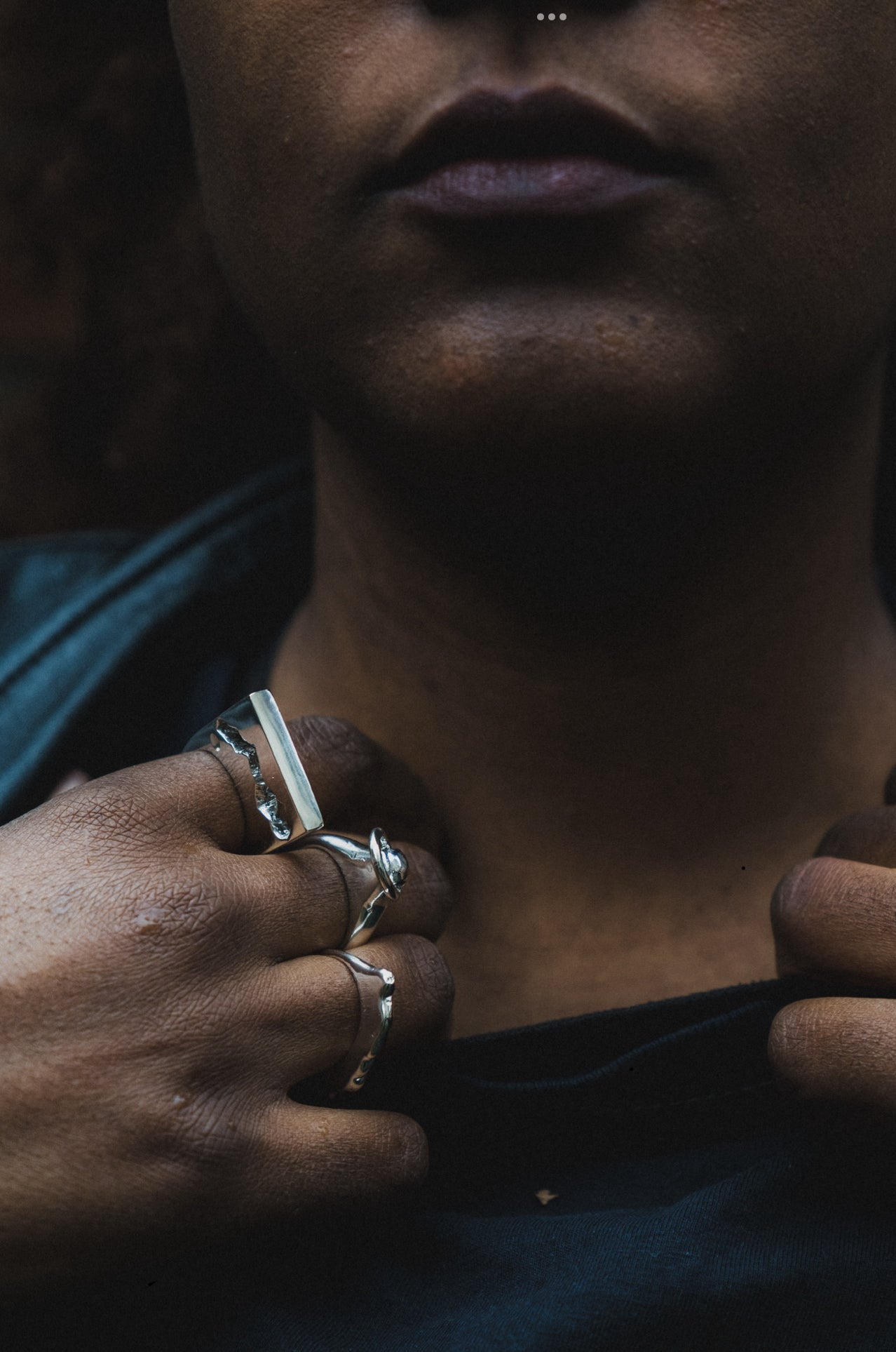Cette bague en argent, sculptée à la main, allie brutalisme et douceur, créant autour du doigt une forme massive mais élégante.