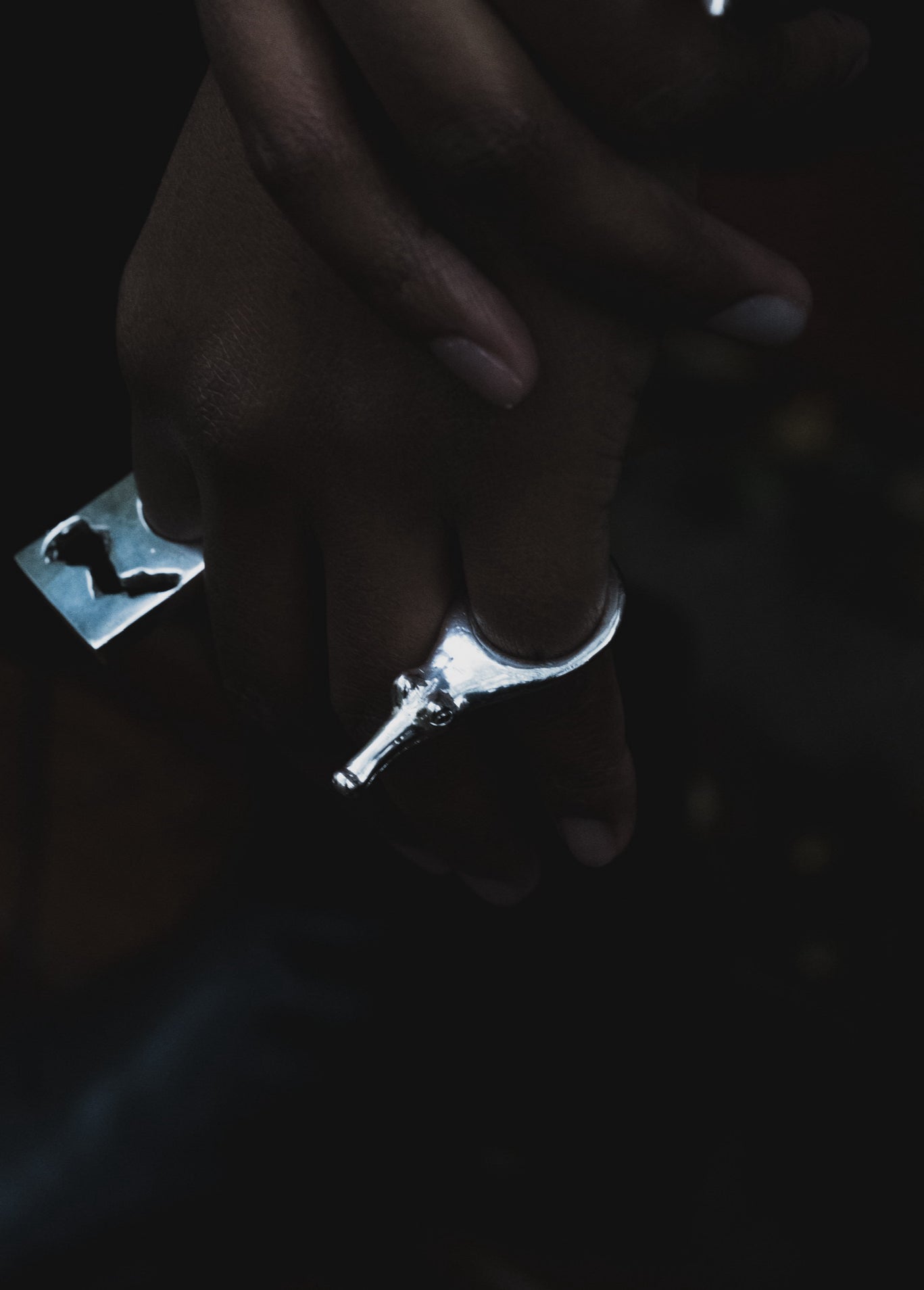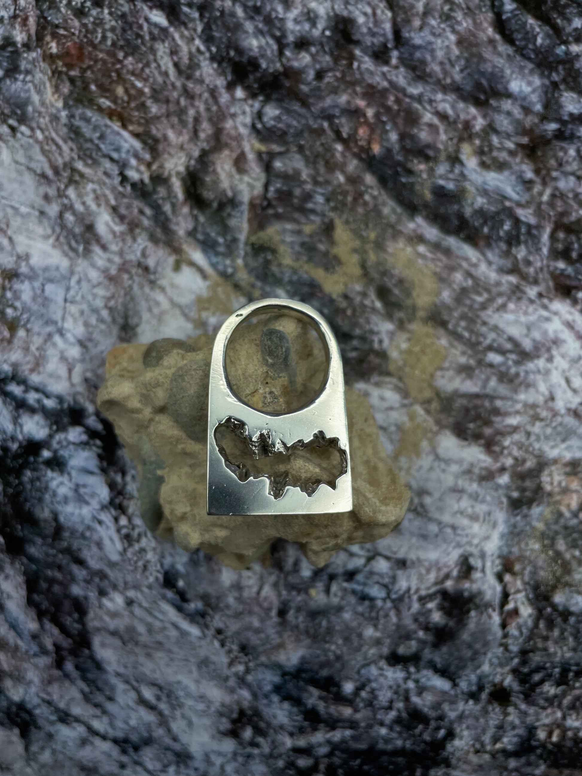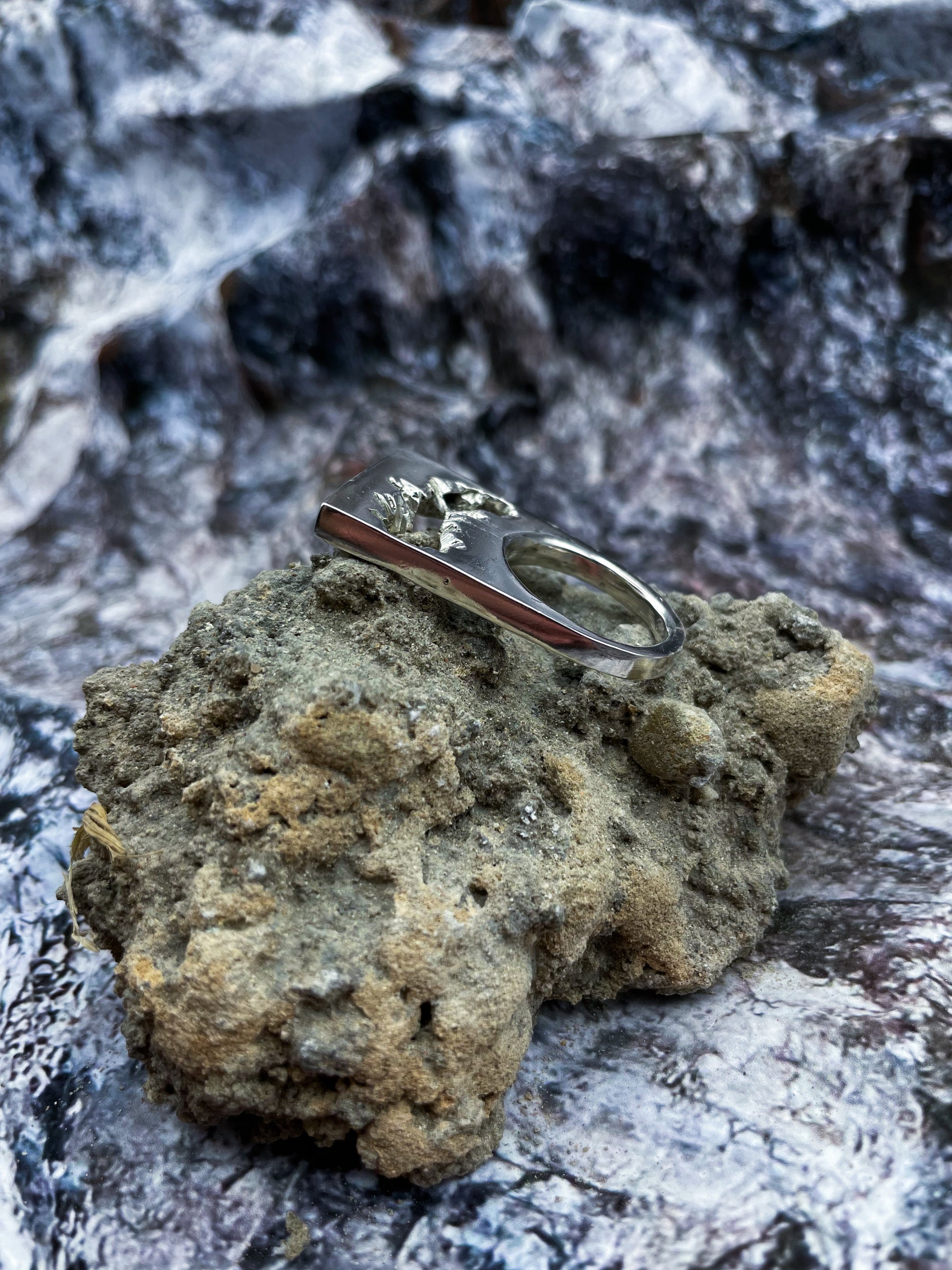 Cette bague en argent, sculptée à la main, allie brutalisme et douceur, créant autour du doigt une forme massive mais élégante.