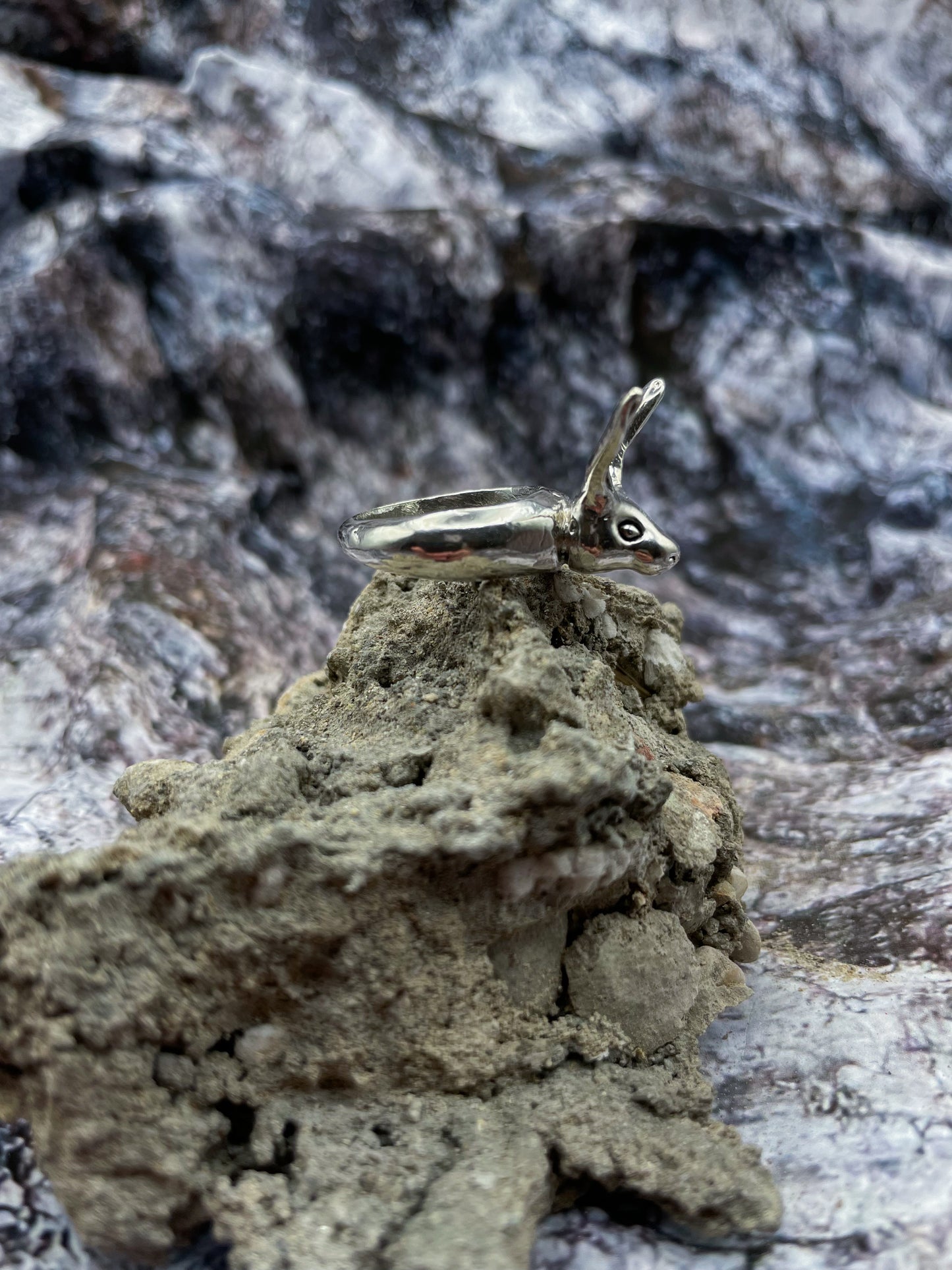 Lièvre d’argent, sculpté à la main sur un large anneau rond.
