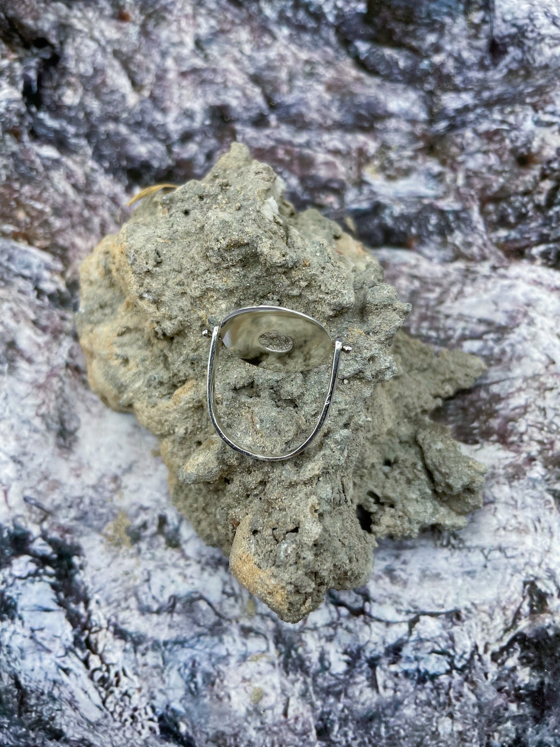Fin disque d’argent monté à la main sur un anneau à la forme originale, créant une apaisante rotation.